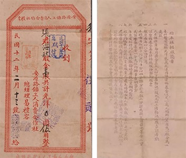 江西萍鄉(xiāng)煤礦自1898年開辦起,安源工人便在經(jīng)濟(jì)上深受剝削,礦局拖欠工資,奸商哄抬物價(jià)。為了維護(hù)工人利益,減少商人的中間盤剝,1922年5月中國共產(chǎn)黨領(lǐng)導(dǎo)的安源路礦工人俱樂部成立不久,便于同年7月創(chuàng)辦了中國工人階級最早的經(jīng)濟(jì)組織——安源路礦工人消費(fèi)合作社。隨著規(guī)模和經(jīng)營范圍進(jìn)一步擴(kuò)大,消費(fèi)合作社流轉(zhuǎn)資金嚴(yán)重不足,出現(xiàn)了貨品短缺的窘境。為了解決資金不足的問題,1923年初,消費(fèi)合作社決定在俱樂部部員中招股,制定了《招股簡章》。工人們深信消費(fèi)合作社就是為大家謀利益的經(jīng)濟(jì)實(shí)體,盡管十分困難,仍踴躍認(rèn)購股票,很快就籌集到股金7800余元,連同俱樂部撥來的活動經(jīng)費(fèi)一起,共計(jì)資金1.8萬余元。消費(fèi)合作社給每位認(rèn)股者發(fā)了自行設(shè)計(jì)的股票作為憑證。