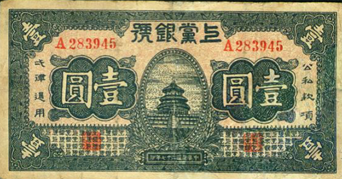 1938年,為了獨(dú)立自主地發(fā)展和鞏固根據(jù)地,嚴(yán)防蔣介石、閻錫山經(jīng)濟(jì)封鎖,晉東南抗日根據(jù)地在沁縣成立上黨銀號(hào),發(fā)行“上黨票”。上黨票初發(fā)行時(shí)與法幣、晉鈔、銀元以及根據(jù)地各縣銀號(hào)發(fā)行的縣票同時(shí)流通于晉東南、晉南、晉中、冀南等部分縣域,1938年發(fā)行的面額有拾元、伍元、貳元、壹元、伍角、貳角伍分、貳角、壹角等8種票面10種版別。壹元票的主圖設(shè)計(jì)為體現(xiàn)根據(jù)地貨幣特色,天壇主圖的下面倒印有一“黨”字暗記。1940年初,“上黨銀號(hào)”結(jié)束,其財(cái)產(chǎn)并入“冀南銀行”時(shí),共發(fā)行上黨票300余萬(wàn)元。