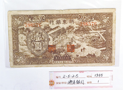1945年4月1日,浙東銀行在浙江余姚成立,發(fā)行了18種36式浙東銀行幣。浙東銀行紙幣每元折合大米一市斤,不會(huì)貶值,在浙東人民群眾中享有很高的信譽(yù)。