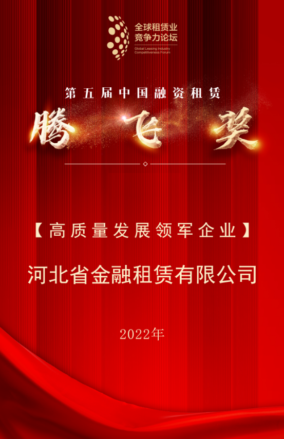 日前,第九屆全球租賃業(yè)競爭力論壇年度峰會圓滿召開,河北省金融租賃有限公司(以下簡稱“河北金租”或“公司”)再度攬下中國融資租賃“騰飛獎”,榮獲“高質量發(fā)展領軍企業(yè)”榮譽。