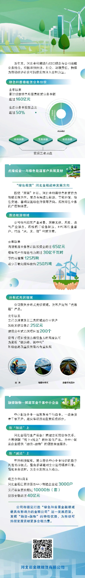 圍繞“雙碳”目標(biāo),河北金租將綠色租賃作為戰(zhàn)略發(fā)展方向,重點(diǎn)布局清潔能源、節(jié)能環(huán)保、綠色交通、基礎(chǔ)設(shè)施綠色升級(jí)等方向,拓展綠色業(yè)務(wù)的廣度和深度。